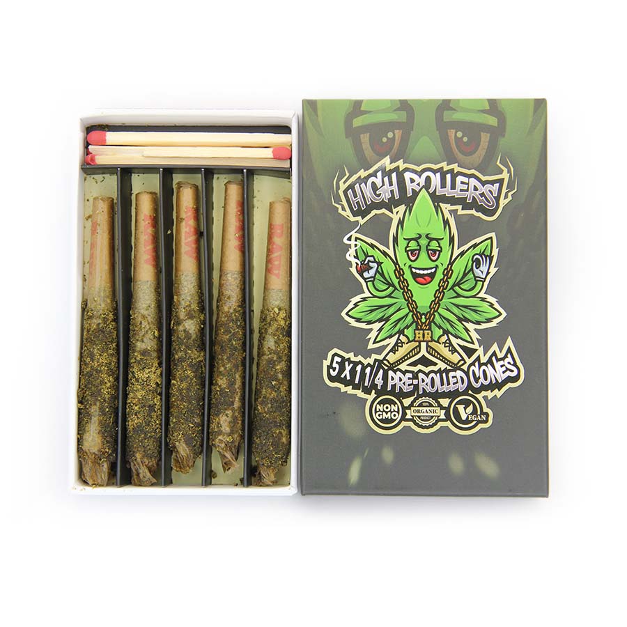 High Rollers, carries 5 x 1 1/4 packs of pre-rolled organic cones. Each cone is filled with roughly .75 grams of premium AAA-AAAA flower.