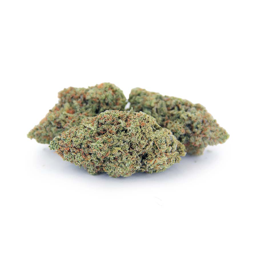 Strawberry Cheesecake is an indica dominant hybrid (70% indica/30% sativa) strain created through a three-way cross of the infamous White Widow X Chronic X Cheese strains. This powerful celebrity child has an average THC level of up to 22% and an average CBD level of about 2%, although it has been recorded higher. Strawberry Cheesecake is most famous for its taste and smell, of course – it has a distinct creamy strawberry cheesecake flavor that makes may make you think that you’re actually smoking a cheesecake! The smell has a sickly sweet berry creaminess to it that only makes you want more! The Strawberry Cheesecake high has a smooth and fast onset that leaves you lightly euphoric and uplifted with a slight sense of cerebral energy and motivation. You won’t be overwhelmed by paranoia or anxiety as your mind soars into utter bliss, and will be more than willing and capable to tackle any tasks that come your way during the day! Due to these effects and its high THC level, Strawberry Cheesecake is said to be perfect for treating chronic pain, mild to moderate cases of depression, chronic stress or anxiety, and chronic fatigue. This bud has small round and dense pebble-shaped forest green nugs with dark olive green leaves, fiery orange hairs, and a frosty layer of fine crystal white trichomes.